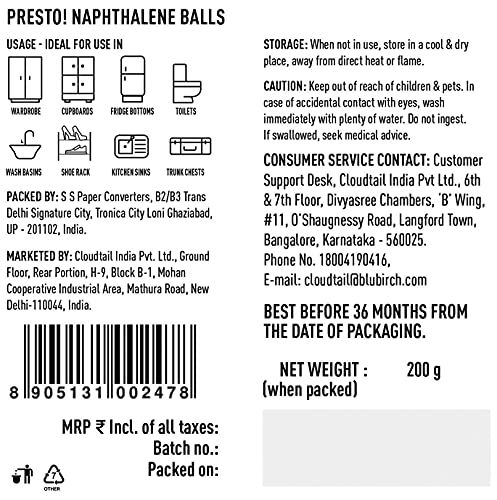 Amazon Brand – Presto! brings to you naphthalene balls. These round shaped balls are convenient to use and can be kept in wardrobes, bookshelves and boxes to prevent the growth of mildew and moths. When placed on clothes, these white balls safeguard your garments from fabric-eating insects and do not leave any stain behind. The pungent smell of naphthalene repels cockroaches, rodents and reptiles, thus allowing you to keep your home, workplace and garden insect-free. Available in ten packs of 200 g, these mothballs control foul odour in your washrooms and toilets. Presto! Naphthalene balls are an effective solution to protect your belongings from pests.
